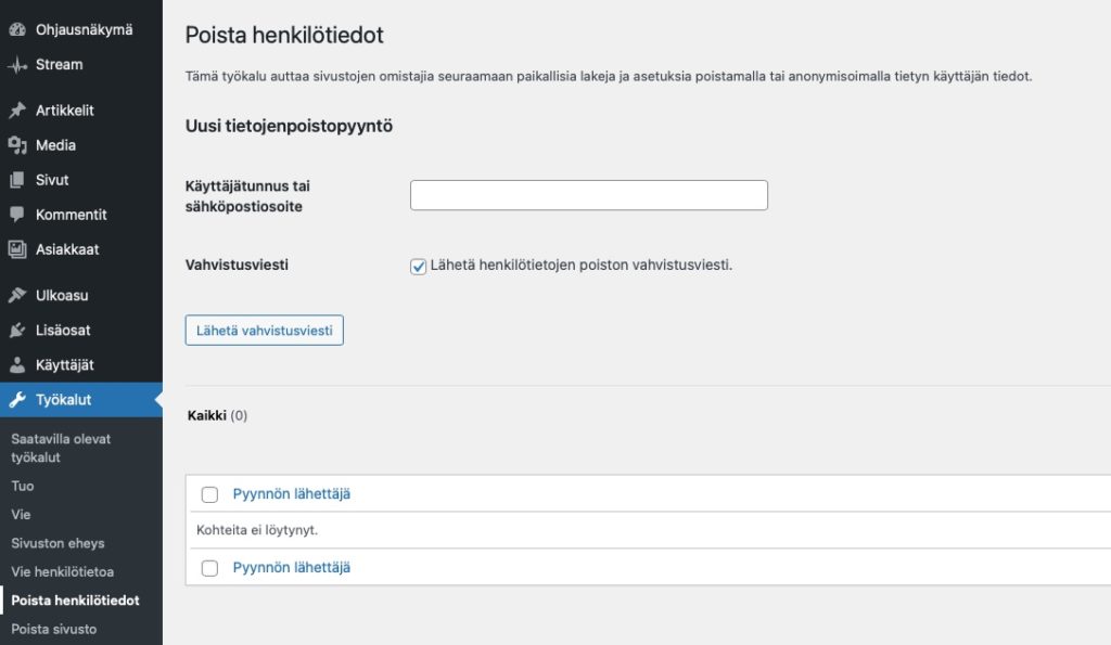 Sometimes customers want to have their personal data removed from the WooCommerce customer registry. WordPress has a built-in tool for this that also notifies the customer about the deletion of their personal data.